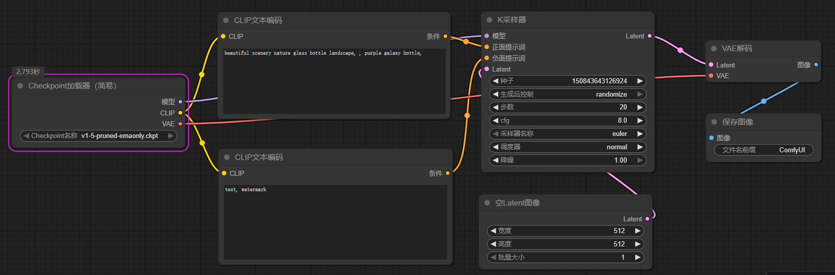 最常用的采样器模块,输入模型、条件、种子、步数,输出潜空间图像。