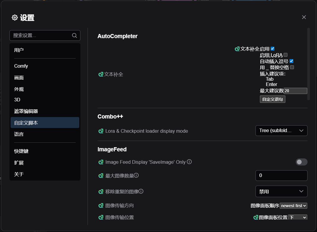 点击按钮将会出现这个自定义语句加载的弹框,下面的地址是ComfyUI_Custom_Scripts插件自带的,用户可以填写其他地址