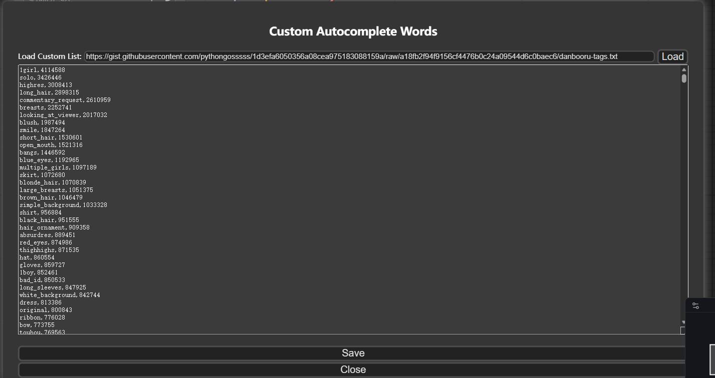 点击保存,文件将会存储到ComfyUI\custom_nodes\comfyui-custom-scripts\user\autocomplete.txt 文件里