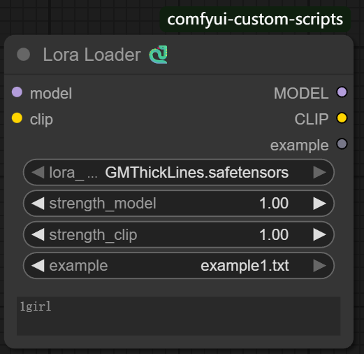 | example | 用来在加载 lora 的同时,携带一段文字信息。例如:我加载lora模型 GMThickLines.safetensors,同级文件夹目录GMThickLines下的txt文件可以选择 |