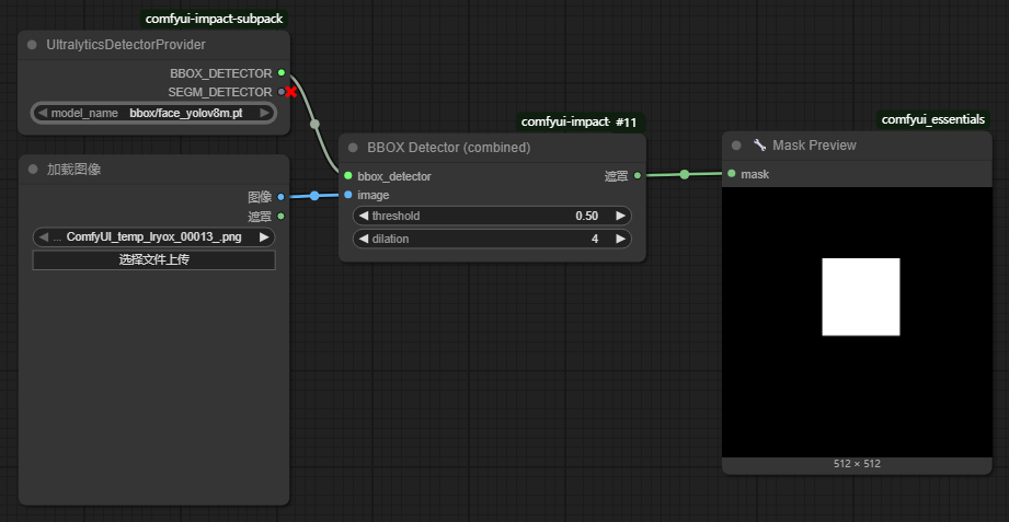 例如,bbox/face_yolov8m.pt 是一个 BBOX 类型的人脸检测模型,因此在连线时应选择 BBOX_DETECTOR 输出口进行连接。