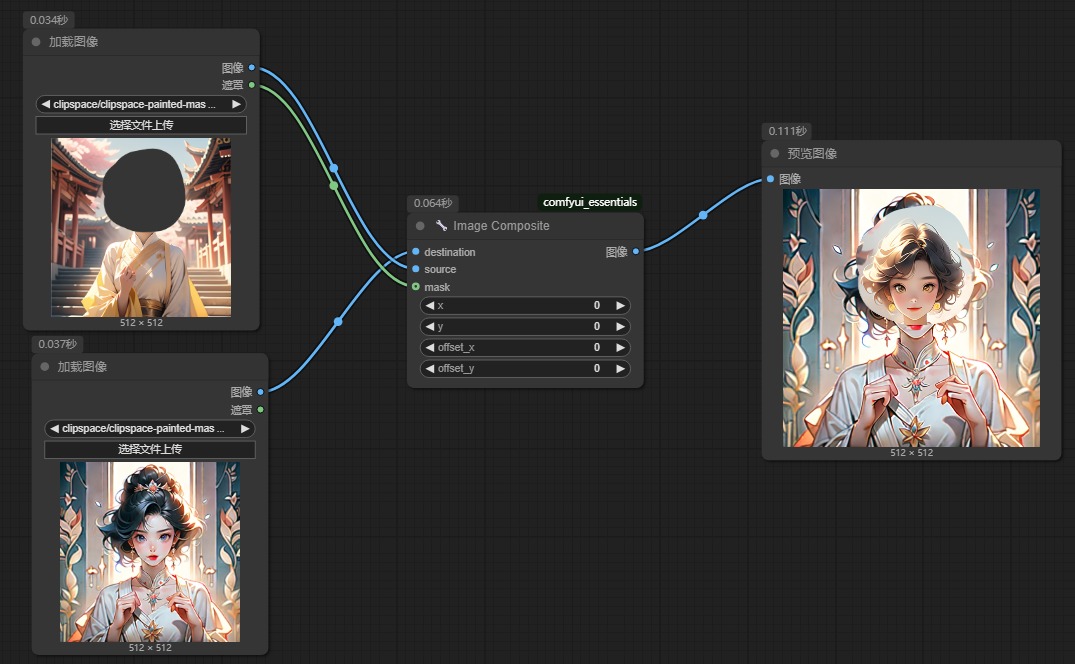 节点功能:根据遮罩(mask),把一张图(源图)合成到另一张图(目标图)上。