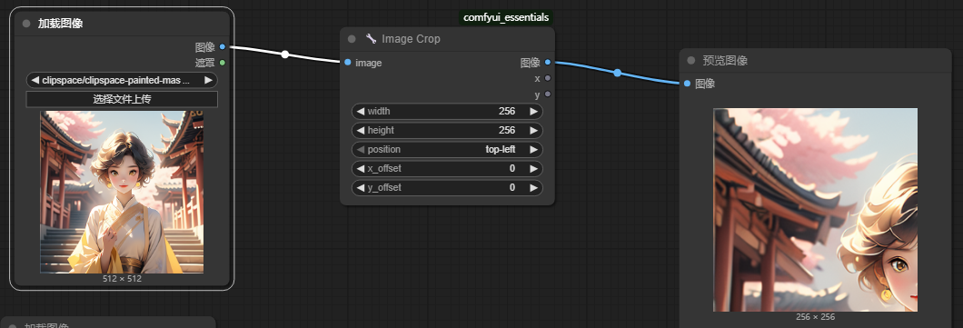 节点功能:从一张输入图像中按照给定的坐标和尺寸裁剪出一个矩形区域,输出那部分子图像。
