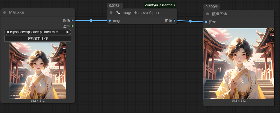 🔧 Image Remove Alpha 节点将输入的 RGBA 图像转换为 RGB 图像,移除透明度信息,使其适用于不支持透明度的环境,如某些图像处理工具或 AI 生成模型。