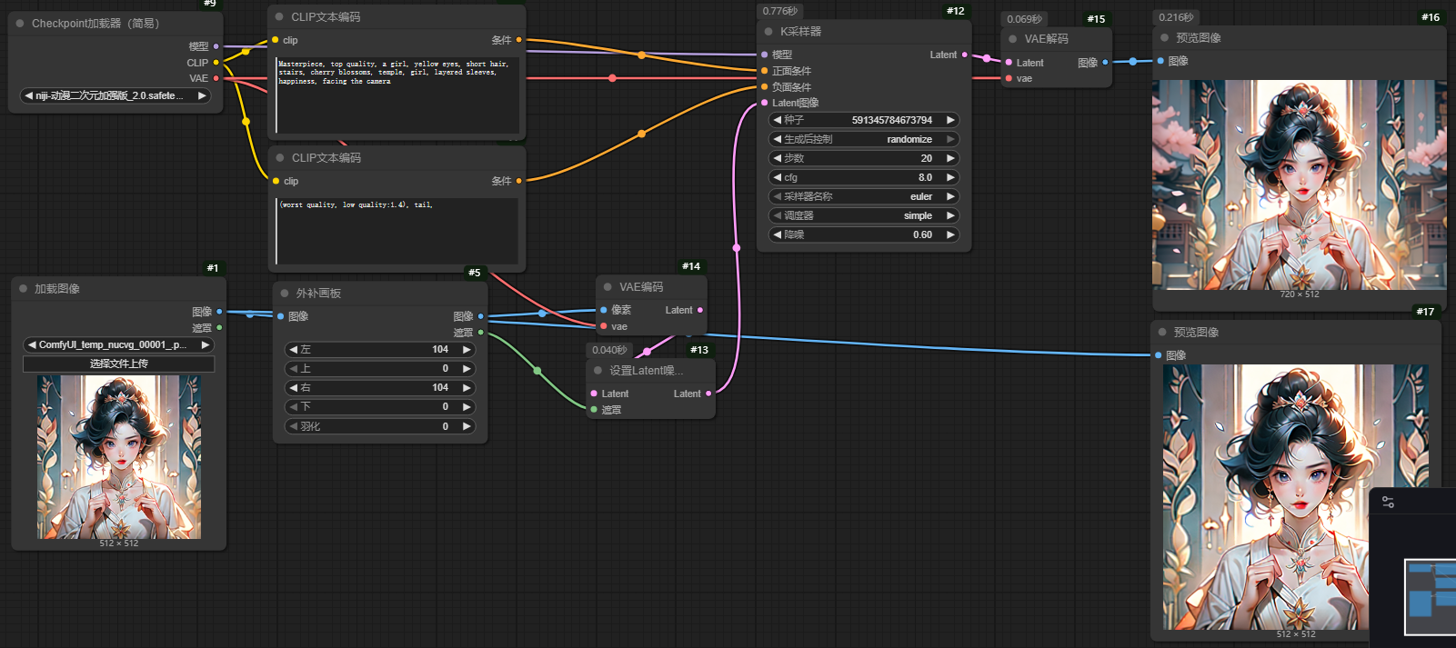下面所示为简单的扩图工作流,将原图左右扩充104像素