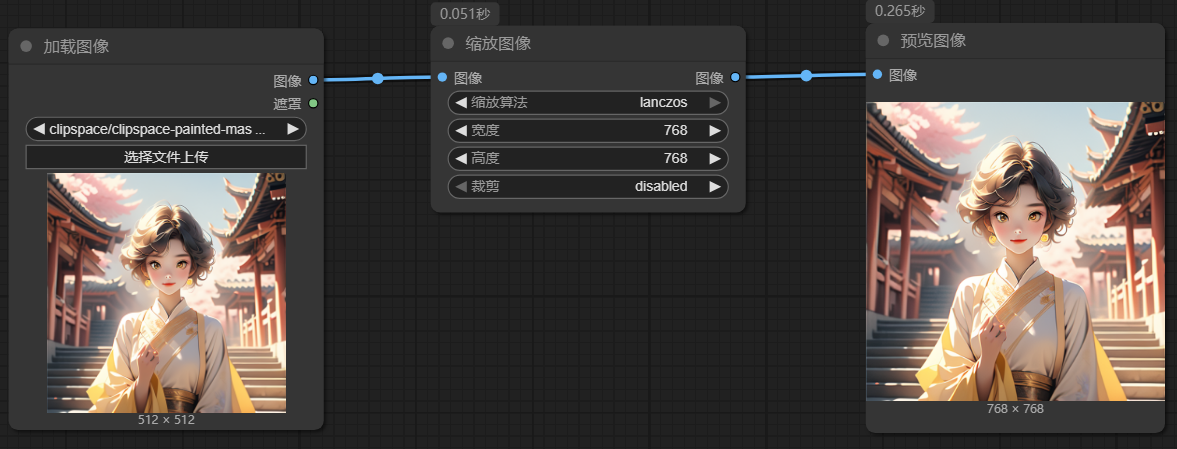 该节点对图像进行放大,使用像素点计算的数学方式。该方法常用作高清放大的初步预处理。