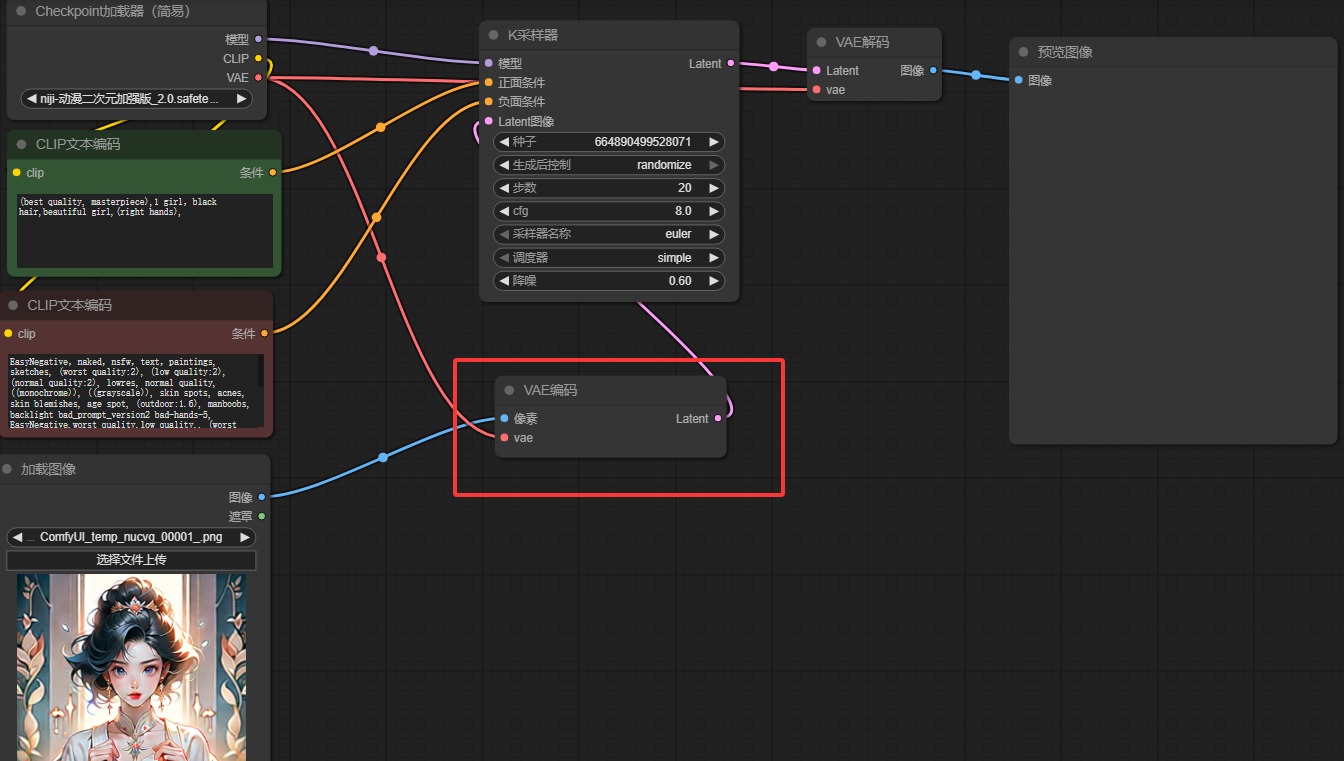 节点功能:对图像进行编码,但是VAE编解码图像会导致存在一定的误差,编码的原因是为了让我们可以在更小的空间上进行图像的生成,我们会称这个空间为latent,也就是潜空间。