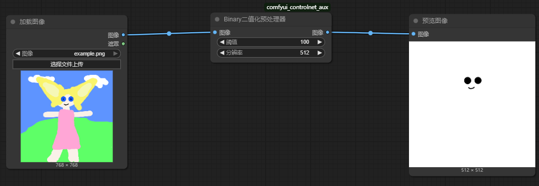 节点功能:该节点是一款基础型的二值化线稿提取器,属于ControlNet的预处理工具之一,作用是将图像中的灰度或线条区域转换为黑白二值图像(通常用于轮廓提取)。