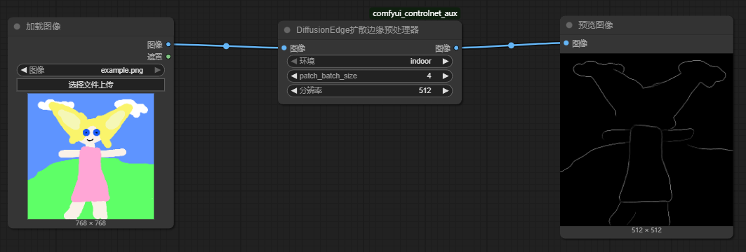 节点功能:该节点是一个基于扩散模型的边缘提取预处理节点,它能在不借助传统滤波算法的前提下,通过神经网络识别出图像中重要的 边缘结构信息,适用于高质量线稿提取场景。