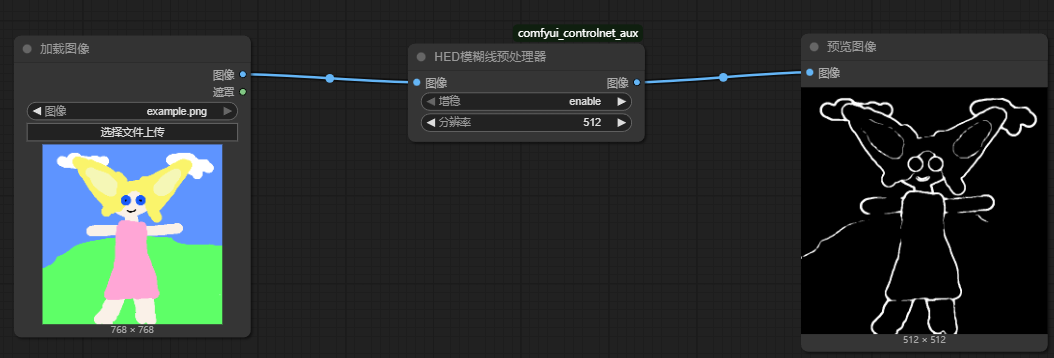 节点功能:该节点提取图像中的轮廓边缘线,生成一张清晰的边缘图,用于ControlNet中的线稿控制(如素描风格、结构保持等图像生成任务)。
