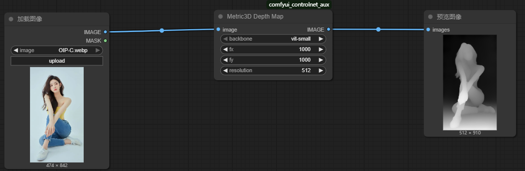 节点功能:该节点使用Metric3D模型生成真实比例的深度图(metric depth map),图中每个像素的灰度值表示它离相机的真实物理距离(例如:以“米”为单位),可用于真实感图像生成、三维建模、光照计算等任务。