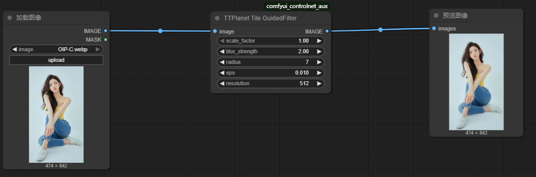 节点功能:该节点使用TTPlanet_Tile_Detector_GF模型对图像进行细节提取和处理,此节点结合了图像缩放、模糊和局部区域细节增强的功能,能够生成更精细和清晰的图像,常用于细节增强、风格化和图像编辑任务。