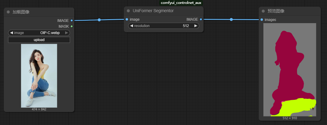 节点功能:该节点使用Uniformer模型进行语义分割(Semantic Segmentation),将输入图像中的不同语义区域进行划分和标注,生成一张分割后的图像,通常用于图像分析、物体识别或区域控制任务。